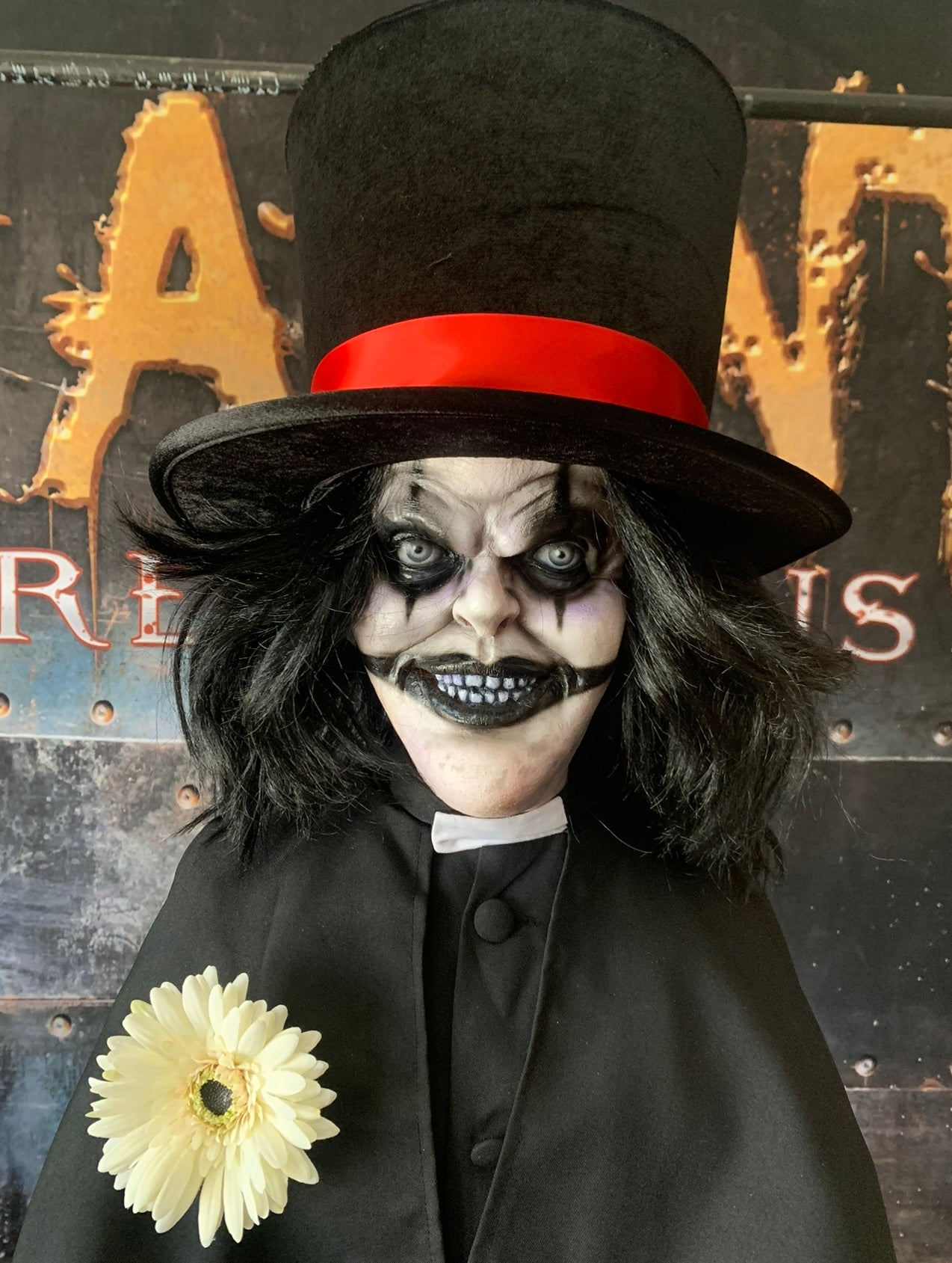 JACK THE CLOWN Made to order static prop. Deluxe priest costume, black wig, top hat, satin gloves and black shoes. The bodies are a complete body mold fully realistic and are made from the highest quality flame retardant flexible polyurethane foam. The faces are custom painted by Nick Lee of Counts Kustoms in Las Vegas. Approximately 48 inches tall. The heads are made from urethane, which offers a very high tear-resistance strength, impact resistance, and wear resistance. The heads are then filled with a flexible polyurethane foam. The wooden base is 15 inches in circumference. Each base has two 3 ft threaded rods that can be removed. The prop slides on or off the threaded rods for display or storage. Clothing or wigs on the props may vary due to availability.All props can be customized, designed and built to your specifications. Please contact me to discuss your own custom designed prop.
